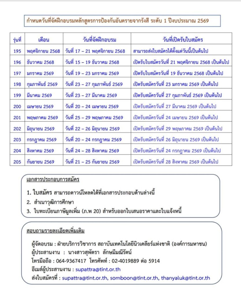ตามที่ สถาบันเทคโนโลยีนิวเคลียร์แห่งชาติ (องค์การมหาชน) หรือ สทน. ได้ประชาสัมพันธ์หลักสูตรการป้องกันอันตรายจากรังสีระดับ 1 (ป้อง1) ประจำปีงบประมาณ 2569 ในหน้าเว็บไซต์ของ สทน. ทั้งนี้ สามารถดูรายละเอียดเพิ่มเติมได้ที่ เว็บไซต์ของ สทน.